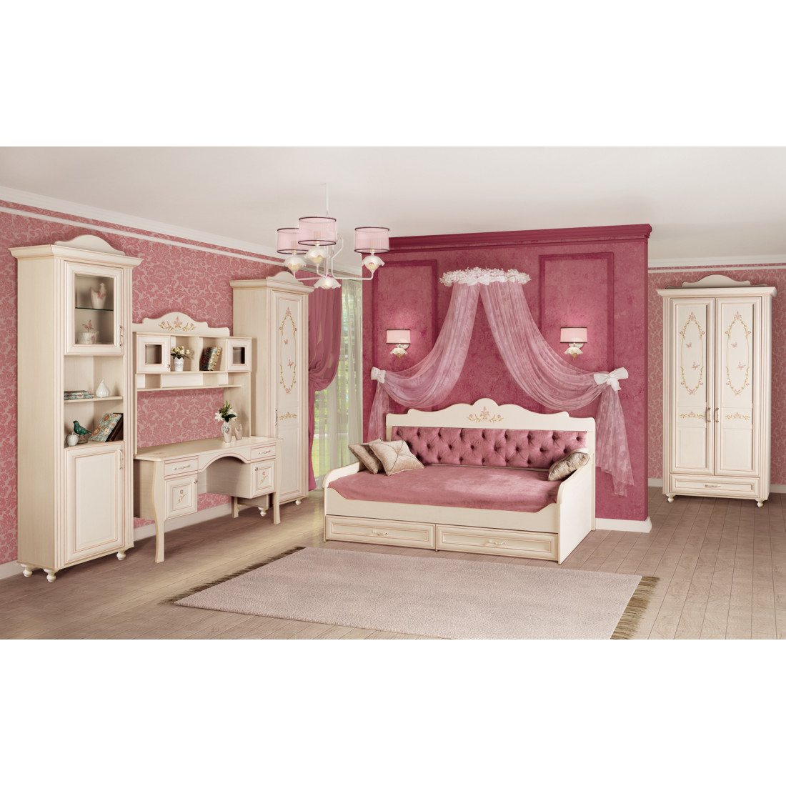 Корпус: ДСП, декор – кремовый белый. Основание кровати – ламели
