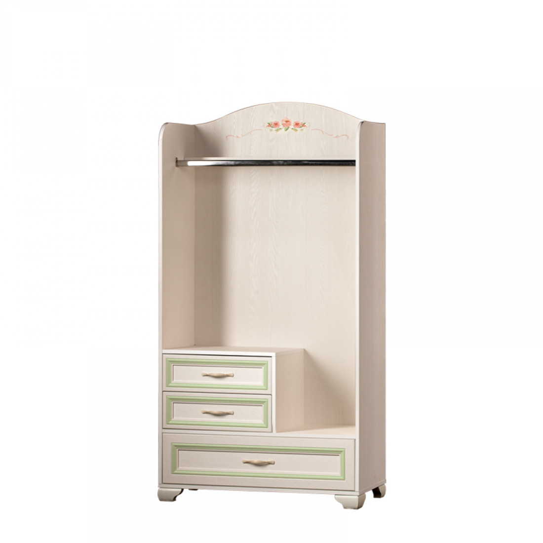 Золотистые ручки с белой патиной подчеркивают классический стиль мебели