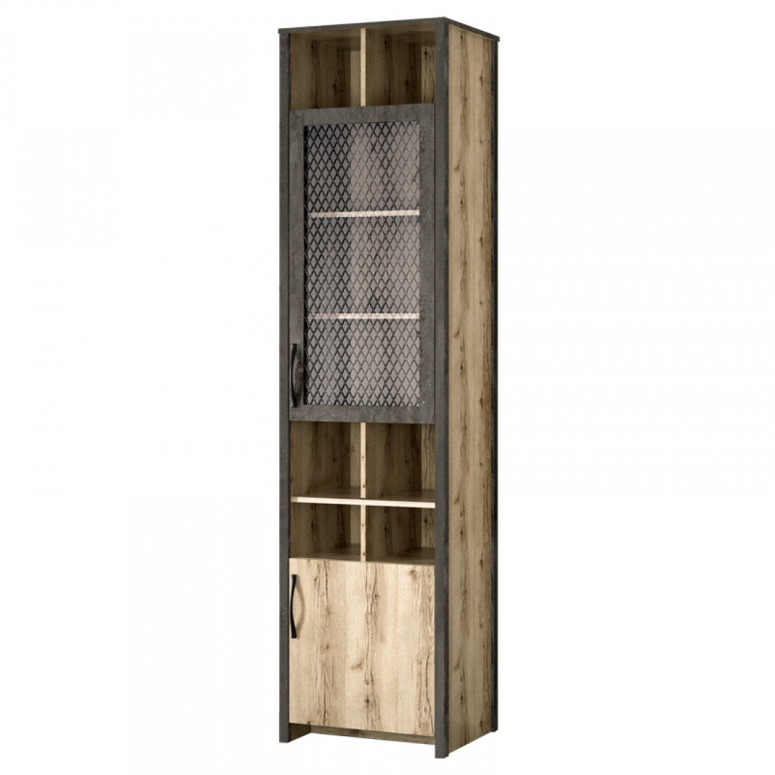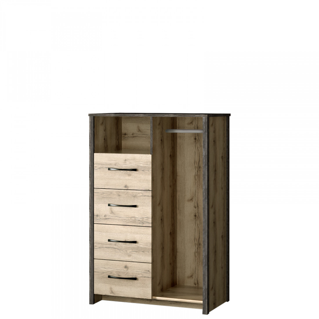 Фасады: ДСП, декор – дуб делано, ЛДСП железный камень, зеркало с фацетом. Рамка: МДФ, декор – сталь черная