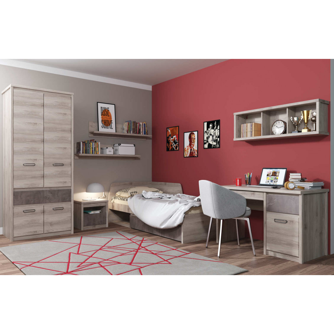 Детская Джаз выполнена в современном стиле. Отличительной особенностью этой коллекции является одновременное применение двух вариантов открывания двери: при помощи металлических ручек на одних фасадах и внутренней фрезеровки на других. Фасады выдвижных ящиков могут быть выполнены как в цвете оникс, так и в цвете каштан найроби. Эта мебель станет заслуженным украшением для любого интерьера.